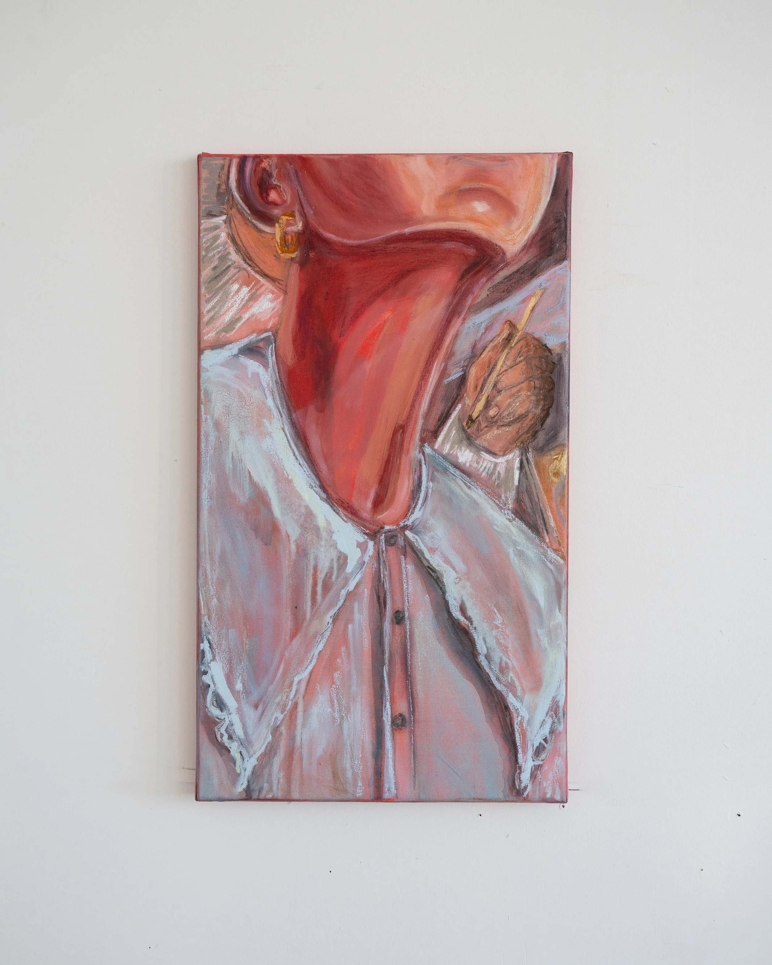 40 x 50cm. Spray paint, oil, oil stick & pastel on linen. Left: Full work. Right: Installation at General Assembly, London.